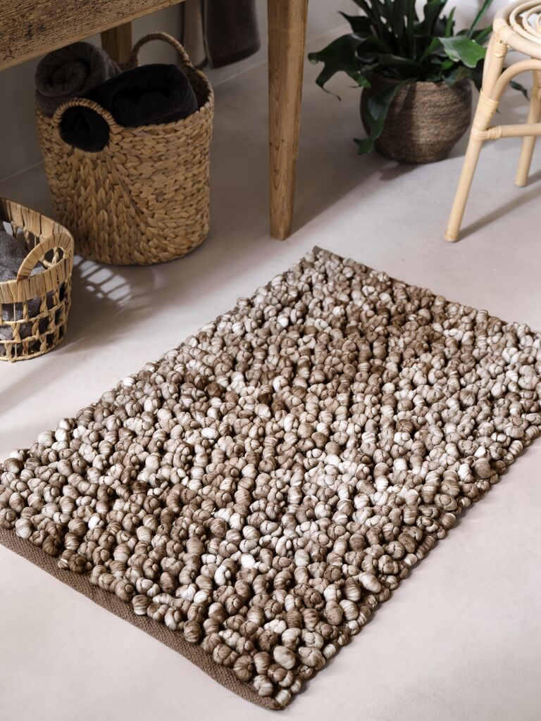 | Instructie | Altijd wassen met soortgelijke kleuren, Niet bleken of centrifugeren, De badmat niet verdraaien, Voor een dagelijkse verzorging van de badmat: schud deze zachtjes om pluisjes of vuil te verwijderen, Hang aan de waslijn om te drogen, NB: Vanwege de structuur van de badmat kunnen draden loslopen in de was. Mocht dit gebeuren, knip de losse draad dan af. Dit zal niet zichtbaar zijn en de badmat niet beschadigen |