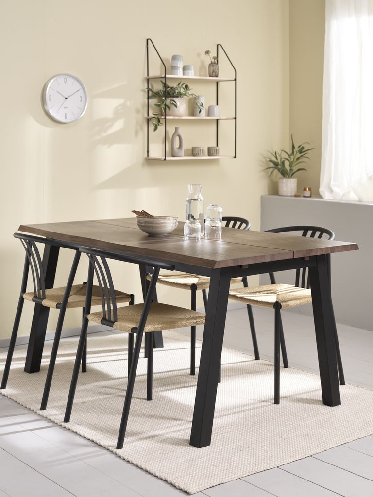 Tafel: Massief eiken en eiken fineer. Excl. verlengblad. B90 x L160 x H76 cm. Stoel: Papierkoord en staal.
