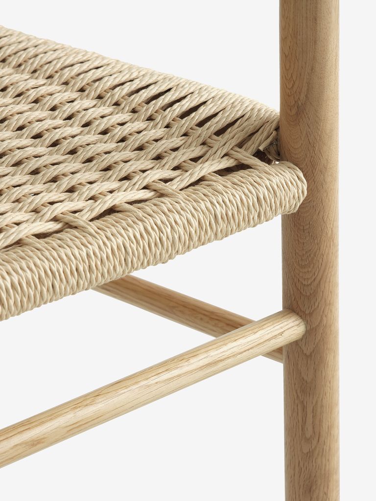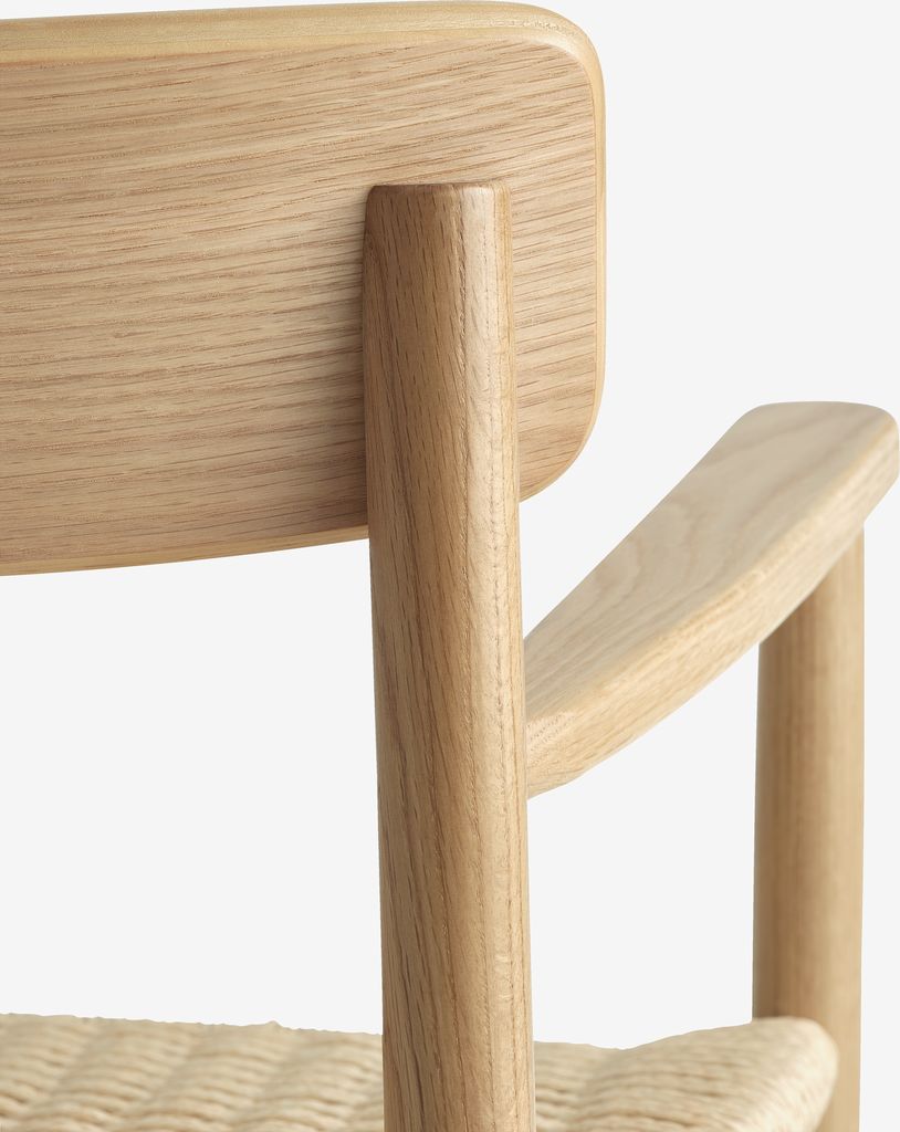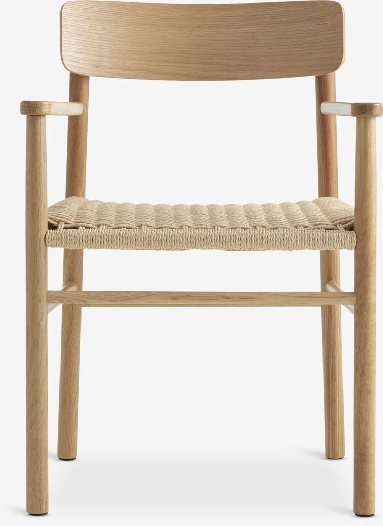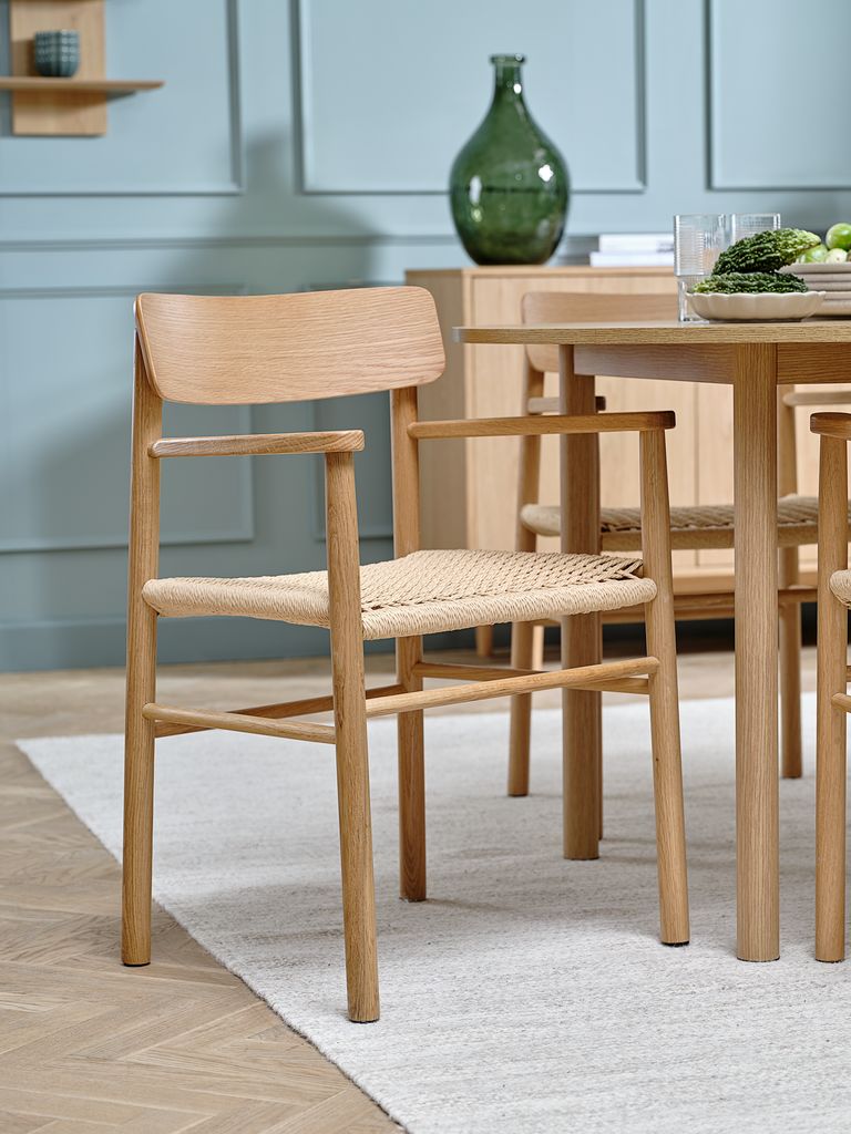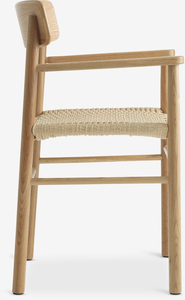 Eetkamerstoel met armleuningen die extra steun en comfort bieden. De stoel heeft een zitting van geweven papierkoord en een frame van massief eikenhout en eiken fineer. Het hout is gelakt voor extra duurzaamheid.