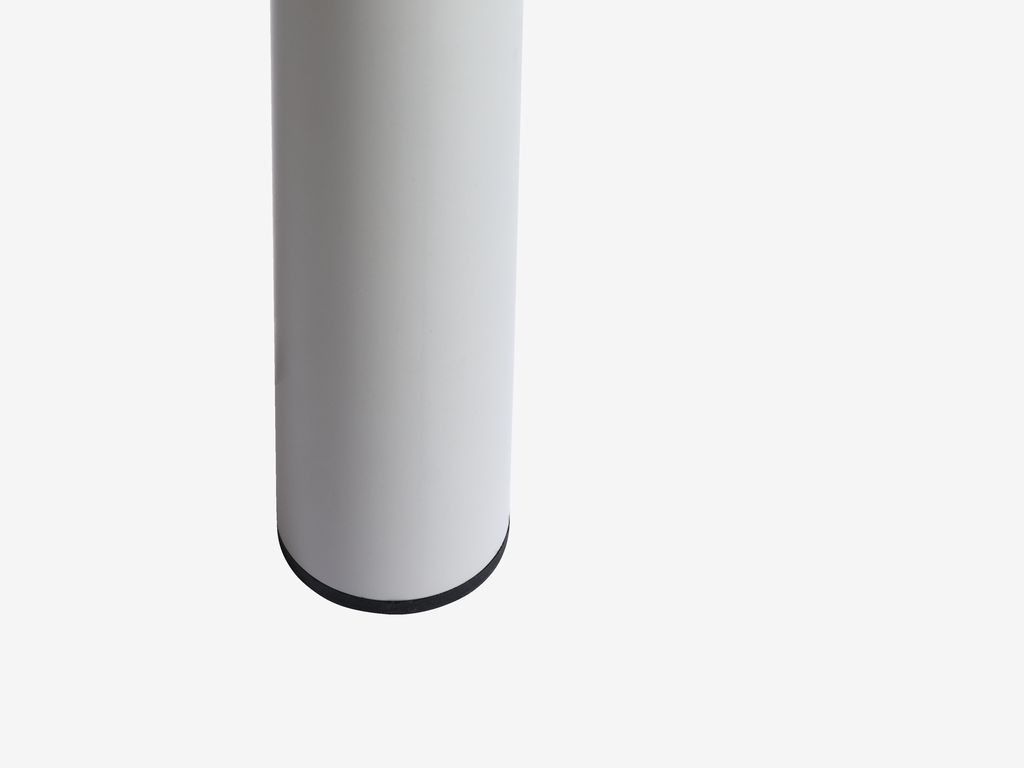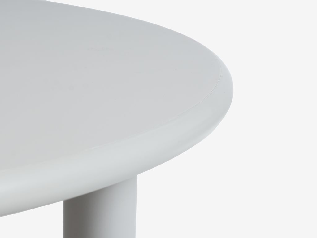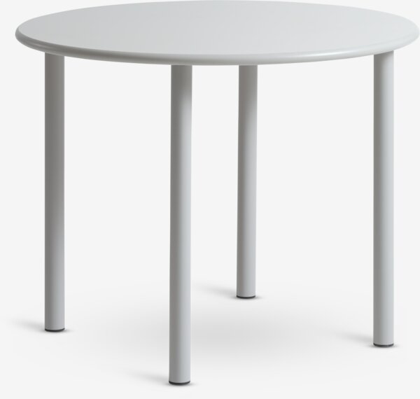 Ronde eettafel met een grijs tafelblad van MDF en bijpassende poten van staal. Het tafelblad heeft een afgeronde rand. Ø100 x H75 cm