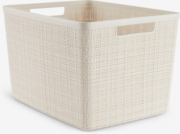 Off-white mand van kunststof met een geweven jute-uitstraling. De mand heeft een inhoud van 20 liter, wat opslag van veel verschillende dingen, waaronder grotere items, mogelijk maakt. Met geïntegreerde handgrepen. B36 x L28 x H23 cm