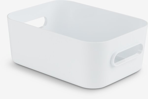 Witte mand van kunststof, ideaal voor het opbergen van kleine spullen in huis. Het is ook goedgekeurd voor voedsel, dus het kan worden gebruikt om de keuken te organiseren. De mand heeft een inhoud van 1,5 liter en is vaatwasmachinebestendig. B14 x L20 x H8 cm