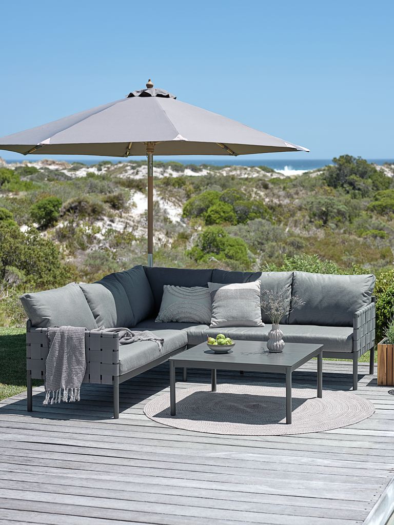 Creëer een ontspannende hoek met de IANO loungeset. Deze grijze 5-zits loungeset bestaat uit een hoekbank met comfortabele kussens en een bijpassende loungetafel met een DURAWOOD® composiethouten tafelblad.