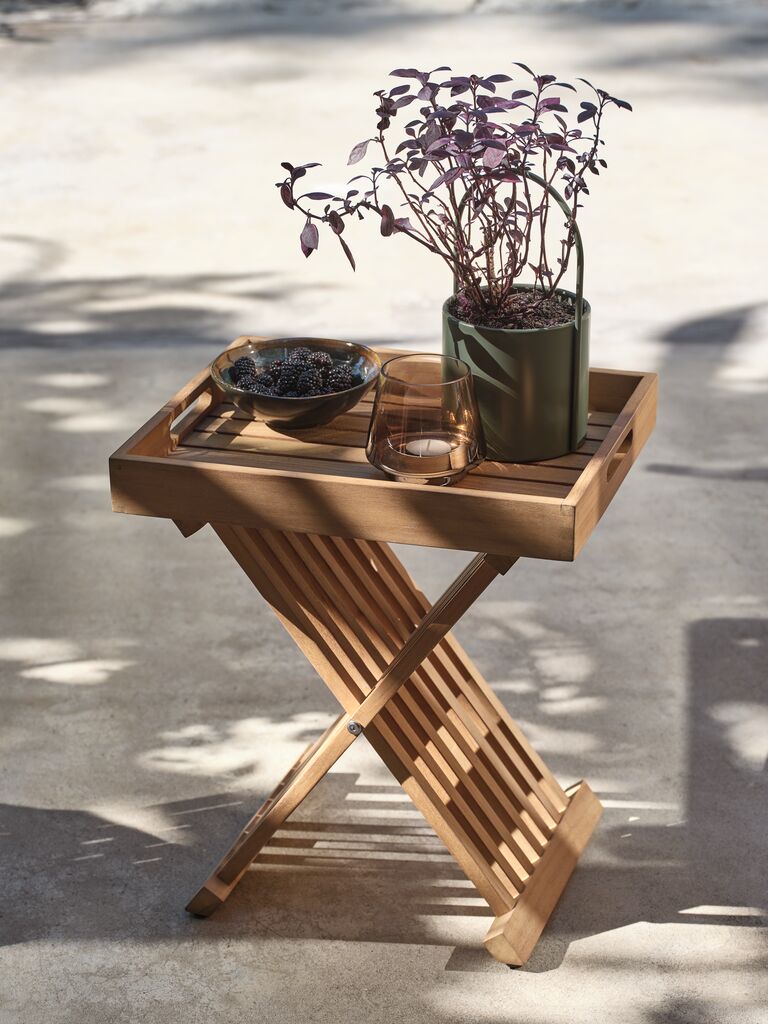Sjarmerende bord med løst brett som er et praktisk og hyggelig innslag på en uteplass. Underdelen kan lett tas inn ellerhenges opp på en krok ute eller inne.