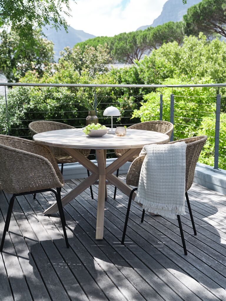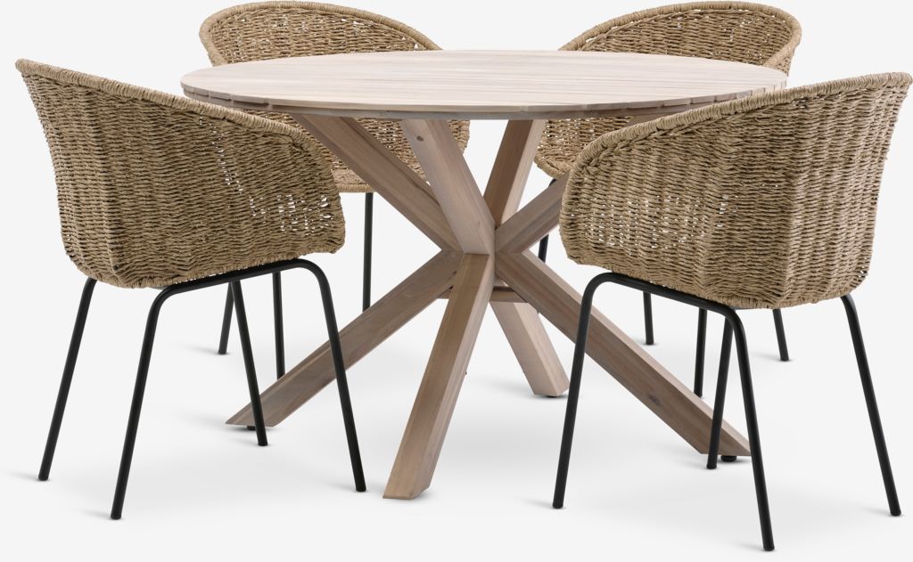 4-zits tuinset. Tafel: Geolied FSC® hardhout. Ø120 x H77 cm. Stoel: Staal en polyrotan.