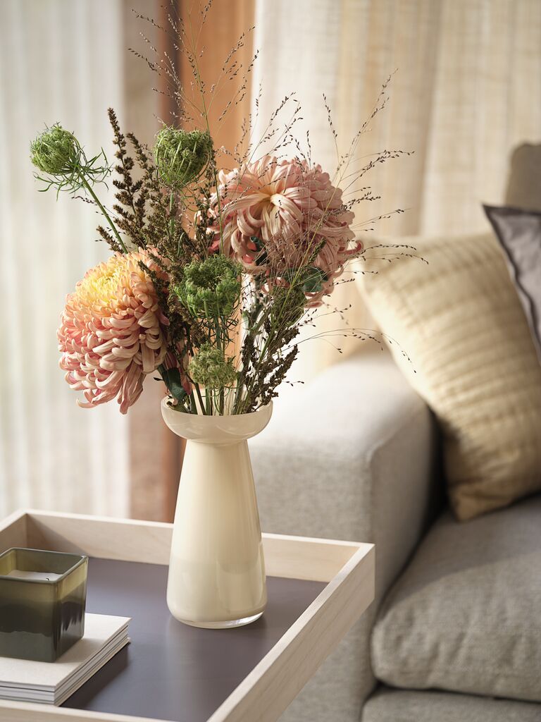 Vaas van glad glas met een moderne vorm en een warme vanillekleur. Door het sculpturale design is hij ideaal om boeketten in te presenteren of om op zichzelf als decoratief object neer te zetten. Ø11 x H22 cm